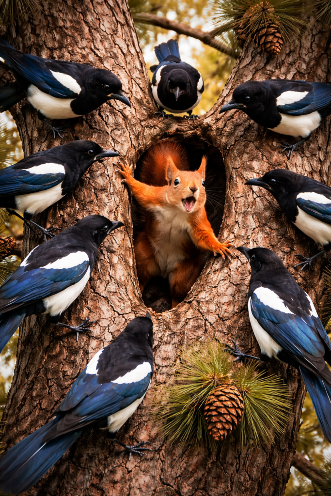 Les pies dĂ©fendent leur nid en groupe lorsquâun Ă©cureuil sâapproche.