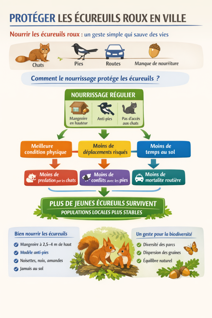 Nourrir rĂ©guliĂšrement les Ă©cureuils roux peut rĂ©ellement rĂ©duire plusieurs sources de mortalitĂ© â conflits avec les pies, prĂ©dation par les chats, accidents routiers â Ă condition que ce nourrissage soit pensĂ© comme un outil Ă©cologique, pas comme une simple distribution de nourriture. Les Ă©lĂ©ments que tu Ă©voques sont cohĂ©rents avec les constats de terrain et avec les analyses publiĂ©es par SOS Ăcureuil Provence, notamment lâidĂ©e que des dispositifs de nourrissage protĂ©gĂ©s peuvent diminuer lâexposition aux prĂ©dateurs et aux dangers urbains.