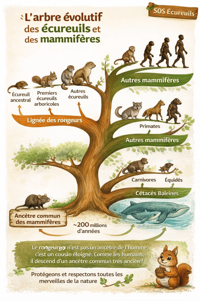 L’écureuil roux ressemble beaucoup à l’ancêtre des mammifères (petit, léger,rapide…) mais c’est un rongeur (espèce apparue plus tard).