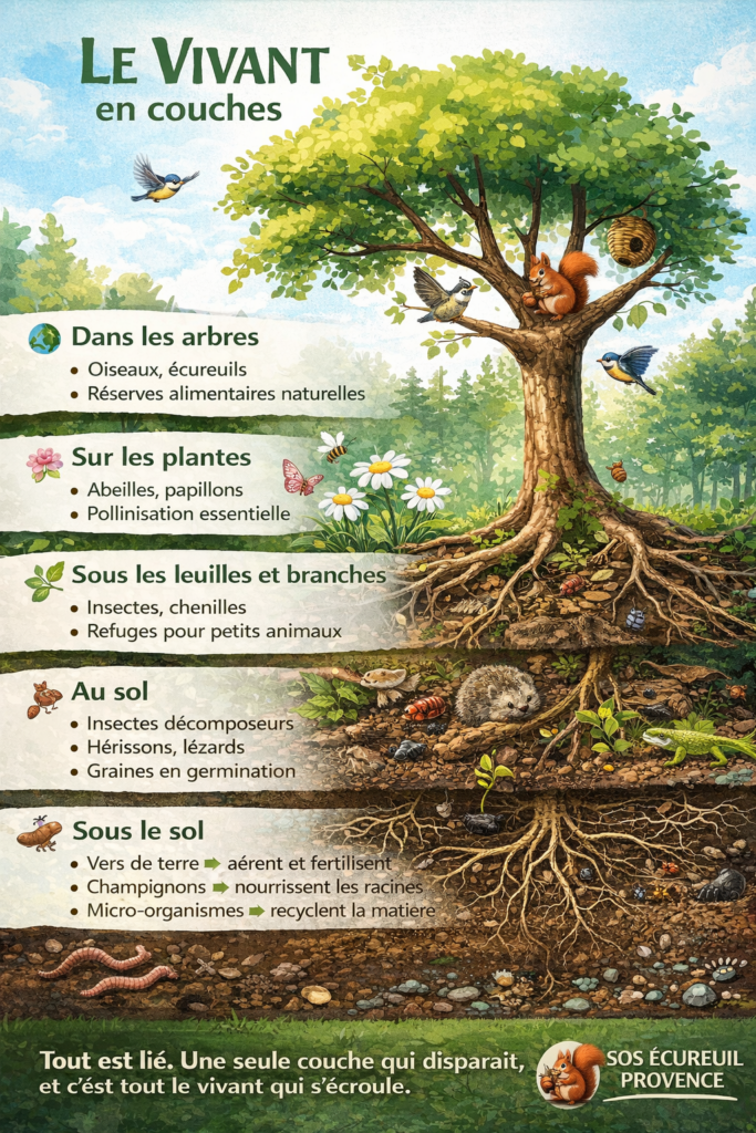 Le vivant fonctionne comme un système en couches : du sol aux arbres, chaque élément dépend des autres.